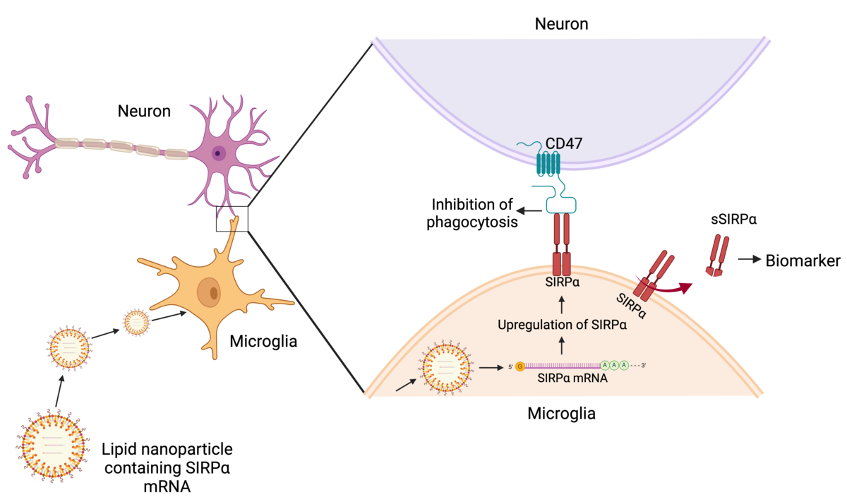 Phagocytosis is normally regulated by signals that either promote or inhibit phagocytosis. One particularly important signal, and main focus of the project, is the SIRPalfa-CD47 pathway. This pathway downregulates phagocytosis, thereby protecting neurons from being mistakenly targeted.