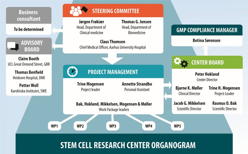 The steering committee consists of Thomas G. Jensen and Jørgen Frøkier, both Head of Department at Department of Biomedicine and Department of Clinical Medicine at Aarhus University, respectively. The steering committee also includes Claus Thomsen, the Medical Director of Aarhus University Hospital. The Project Management consists of Project Manager Trine Mogensen, along with Jacob Giehm Mikkelsen, Bjarne K. Møller, Rasmus O. Bak, and Peter Hokland. The project management group members are responsible for the application to the Innovations Fund Denmark and are experts within their fields of research. Trine Mogensen holds the position as Project Manager, while Peter Hokland is the Center Director in the Center Board. Peter Aadal Nielsen (Innovation Fund Denmark) participates in two board meetings annually. The Advisory Board includes Claire Booth from UCL Great Ormond Street (United Kingdom), Thomas Benfield from Hvidovre Hospital and Copenhagen University (Denmark), and Petter Woll from Karolinska Institutet (Sweden).
