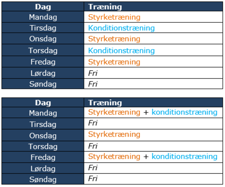 Du vælger selv hvilke ugedage du vil træne, men nedenstående skemaer viser forskellige forslag til hvordan du kan planlægge din træning over en uge.
